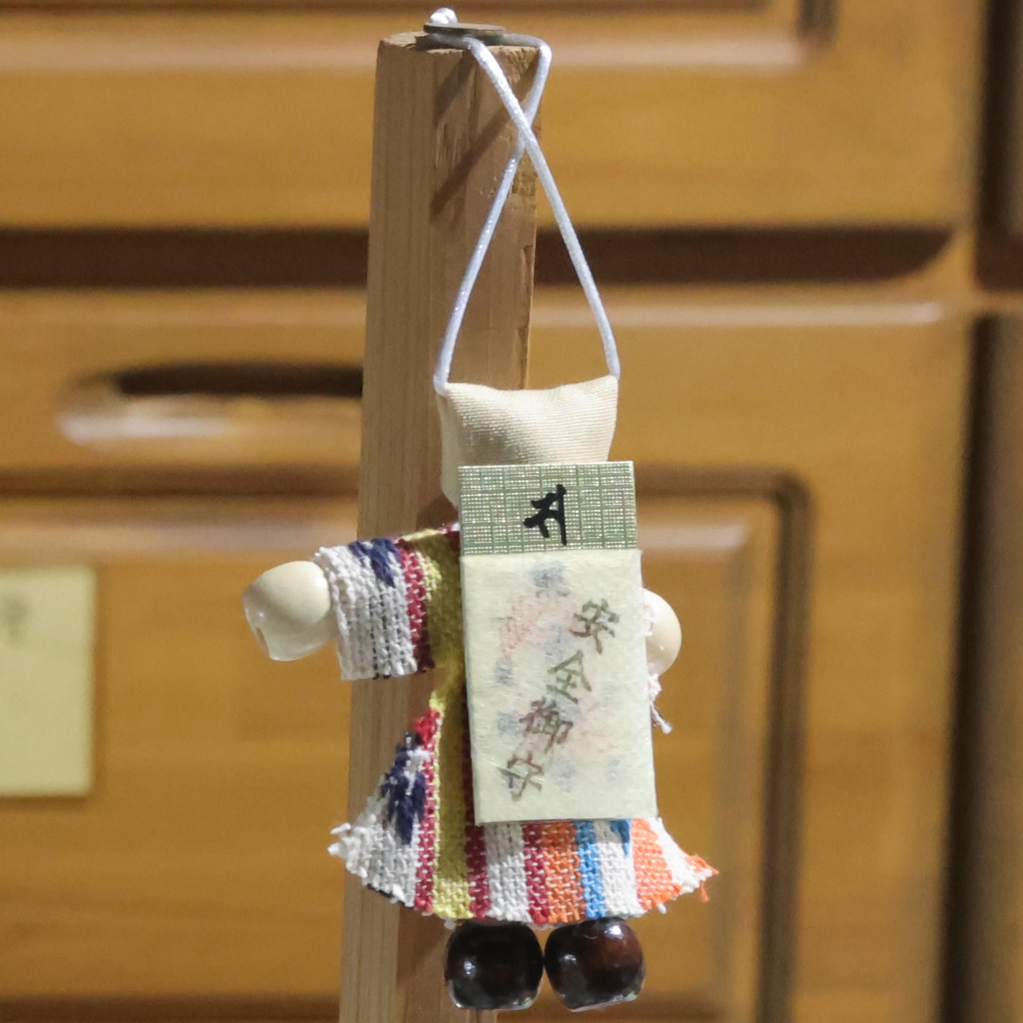 一髪観音様専用の御守りで、交通安全みがわり人形御守りといい、車に吊り下げる御守りです。1年祈祷をしており毎年新しい御守りと交換します。もしくは事故がありましたらしょうねがぬけますのでおさめて頂きます。